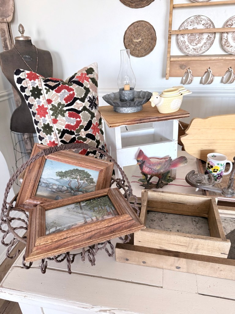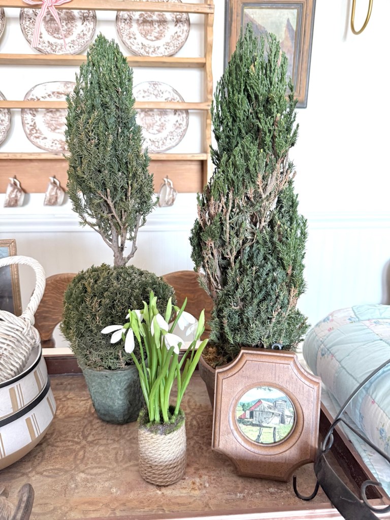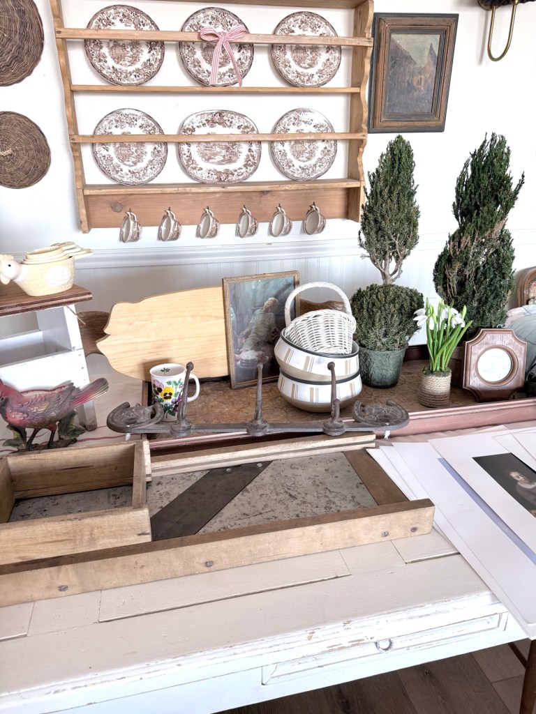 Today’s haul 🤍 What would be your fav? I adore the topiaries and the French pot rack! #furnitureattiffanys #handmedowncottage #homedecor #vintage #thriftstorefinds